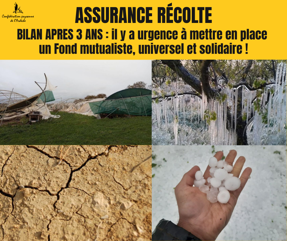 La Confédération paysanne de l’Ardèche a répondu présente ce jeudi 29 Janvier 2026 à l’appel de la Chambre d’agriculture qui organisait une réunion pour faire le bilan après 3 ans de mise en œuvre du nouveau dispositif d’Assurance Récolte ayant remplacé le dispositif de Calamités agricoles au 1er Janvier 2023 pour les agricultrices et les agriculteurs victimes d’aléas climatiques.