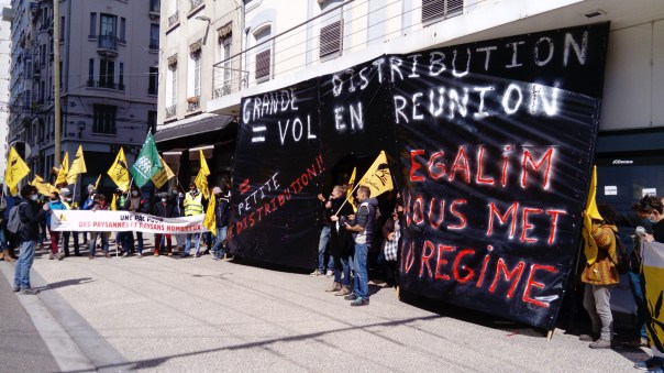 « Y’en à marre, des aides à l’hectare ! » … une phrase, entendue dans la manifestation de ce lundi, qui résume bien l’état d’esprit de cette action qui a rassemblé plus de 300 paysans et paysannes à l’appel de la Confédération paysanne Auvergne Rhône-Alpes, 1ère étape d’une semaine de mobilisation partout en France.