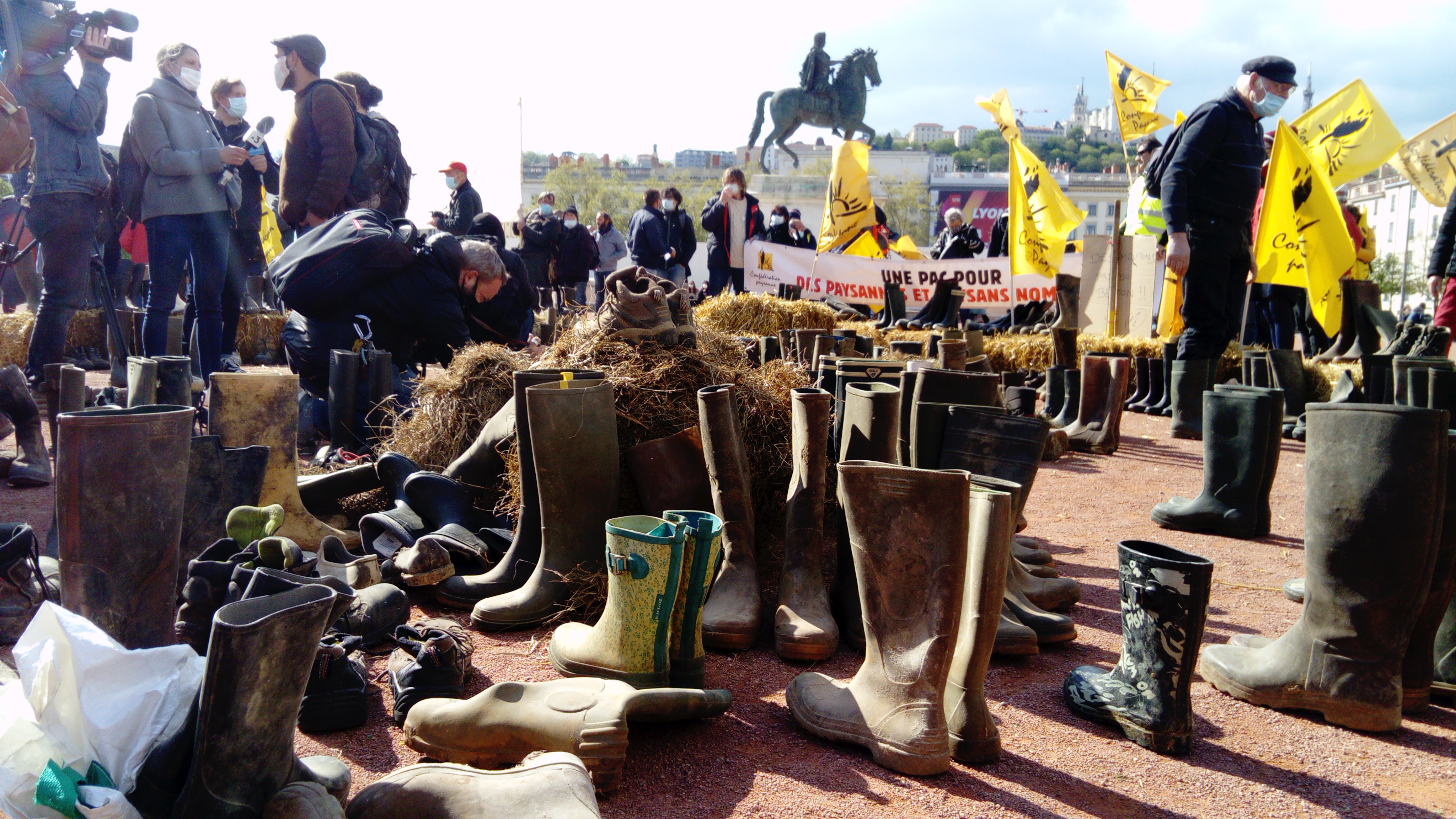De la place de l’Europe à la place Bellecour où des bottes ont été déposées pour symboliser une PAC qui fait disparaître les paysan.nes (avec un arrêt remarqué à Monoprix pour défendre des prix justes), nous avons fait part de nos revendications pour nous avons fait part de nos revendications pour redistribuer les aides PAC vers les actifs pour produire, employer, préserver dans des campagnes vivantes.