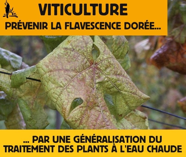 Lutter contre une maladie végétale ou animale nécessite d’accorder une importance clé à la prévention. Les plants contaminés pour les plantations sont aussi un facteur de propagation important. Ainsi, pour éviter la dissémination de la flavescence dorée, l’assurance de travailler avec un matériel végétal sain à la plantation est indispensable. Toute nouvelle plantation, en zone contaminée ou non, devrait obligatoirement être réalisée avec des plants traités à l’eau chaude. C’est aussi en mettant en place ces outils de prévention qu’on limitera à terme l’usage des pesticides pour lutter contre cette maladie. La généralisation du traitement à l’eau chaude serait aussi bénéfique pour la lutte contre d’autres maladies comme la maladie de Pierce (Xyllela Fastidosia) qui s’attaque à plus de 400 espèces et commence à arriver en France.