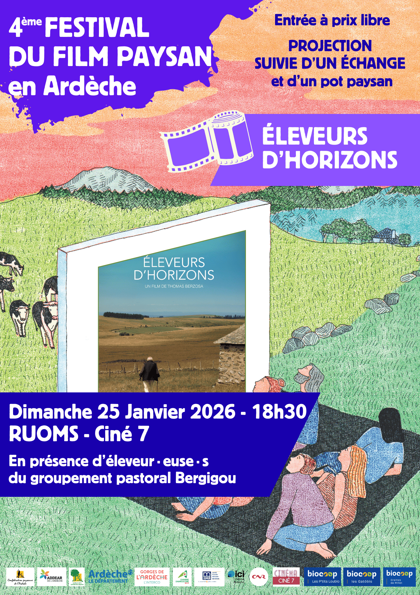 L’affiche est dessinée par Marion Fayolle. Marion est une dessinatrice de presse, illustratrice, autrice de bande dessinée et romancière française originaire d’Ardèche. >> Télécharger l’AFFICHE du Festival Film Paysan 2026 en Ardèche