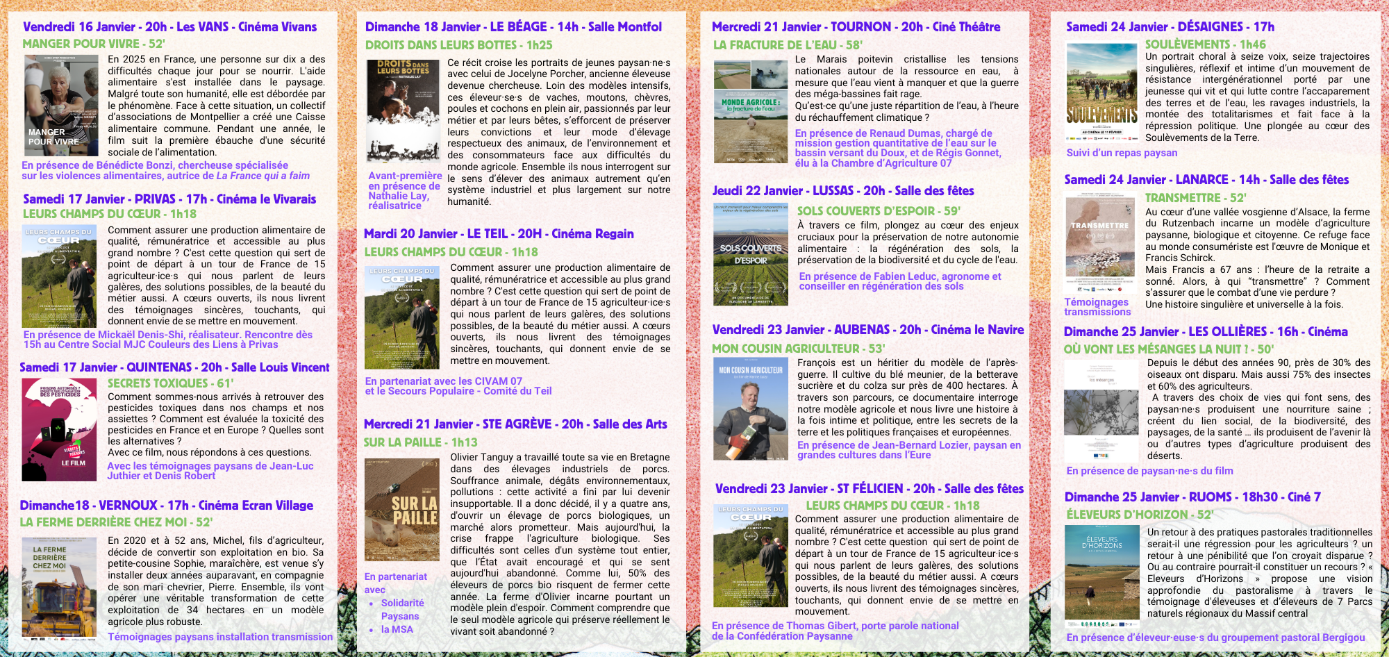 Ces projections seront suivies d’échanges avec les paysannes et les paysans organisés en groupes locaux pour chaque territoire.
