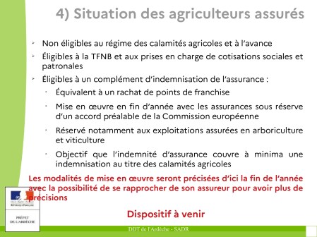 - Pour l’arboriculture le taux de dégrèvement sera de 80% et il sera mis en œuvre début octobre suite à la validation du dossier ardéchois « autres fruits » à la Commission nationale du 29 septembre. La TFNB ayant déjà été notifiée aux propriétaires avec un délai de paiement au plus tard au 15 octobre, il est donc plus prudent de s’acquitter de l’impôt dans les délais et la DDFiP remboursera par la suite une partie de la somme