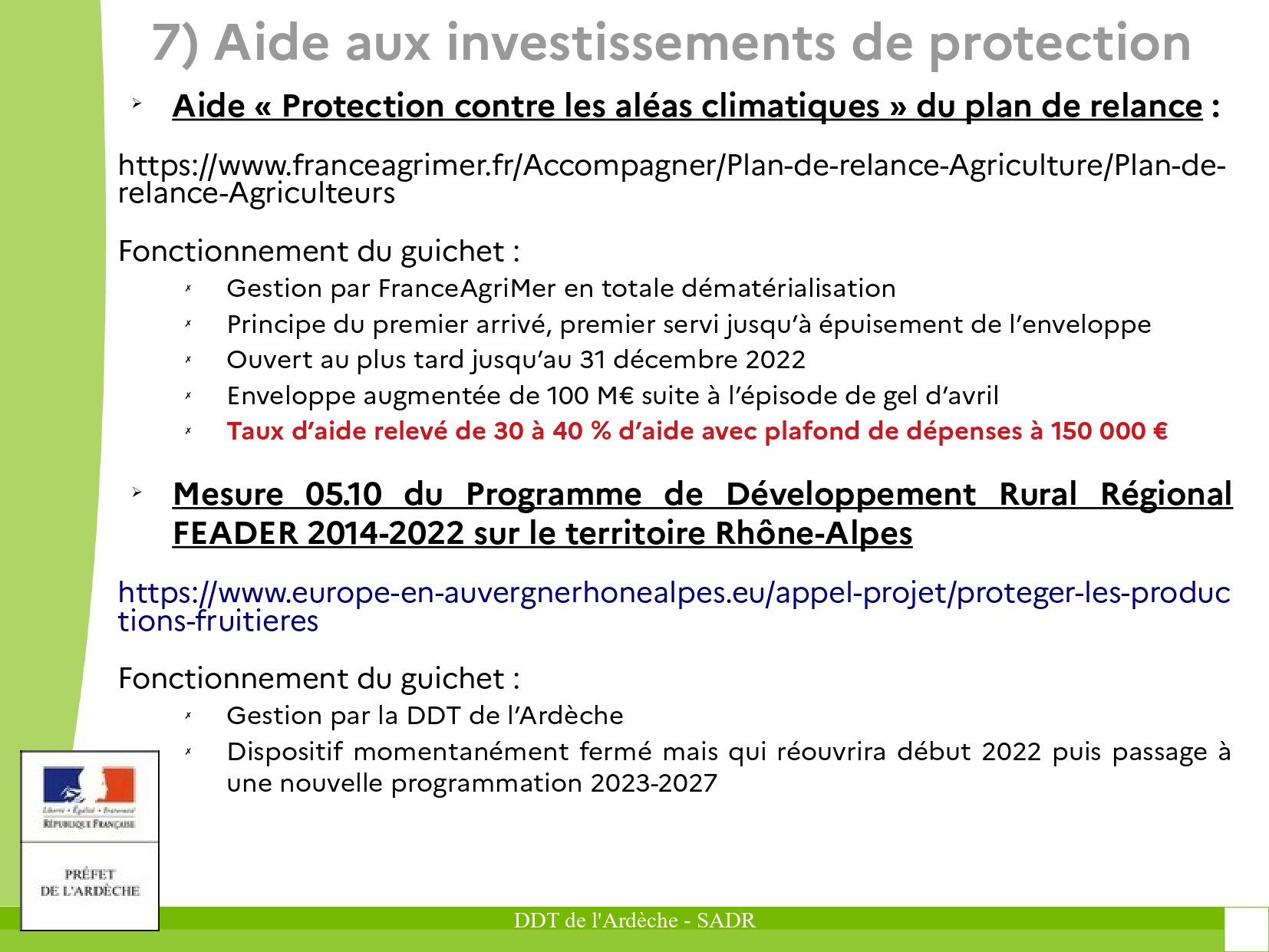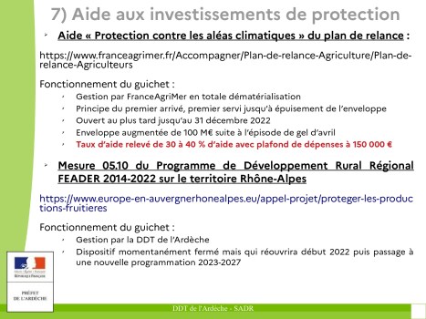 Les dossiers de demande d’indemnisation au titre des Calamités agricoles 2021 (à ce lien) concernant LES PERTES DE RÉCOLTE ET LES PERTES DE FOND EN APICULTURE sont à remplir et à envoyer/déposer auprès de la DDT de l’Ardèche jusqu’au 17 Février 2022