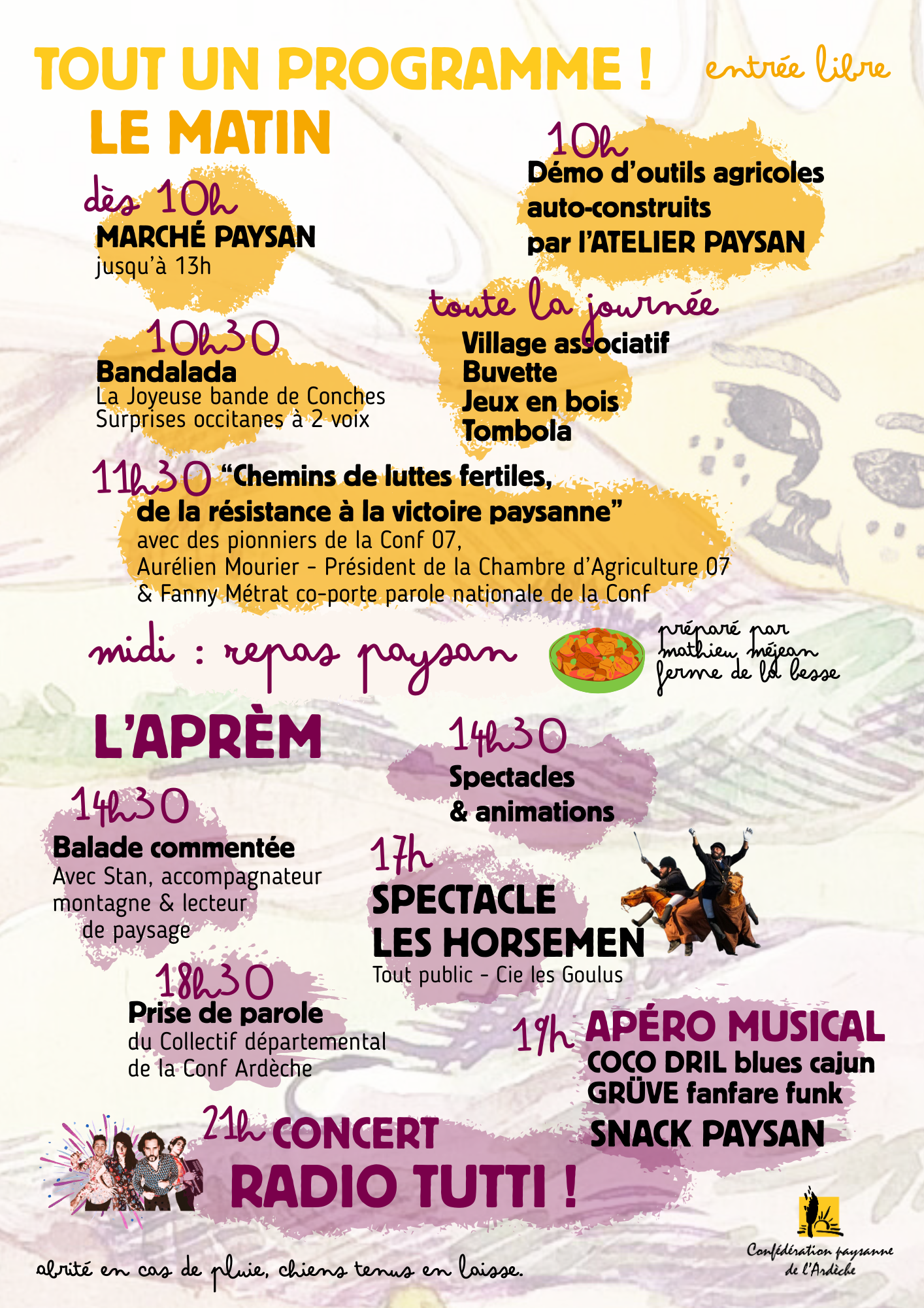 La fête de l’agriculture paysanne, c’est LE rendez vous annuel festif et militant incontournable organisé par les paysannes et paysans de la Confédération paysanne de l’Ardèche pour mettre en avant l’agriculture ardéchoise, ses produits et ses paysan.nes !